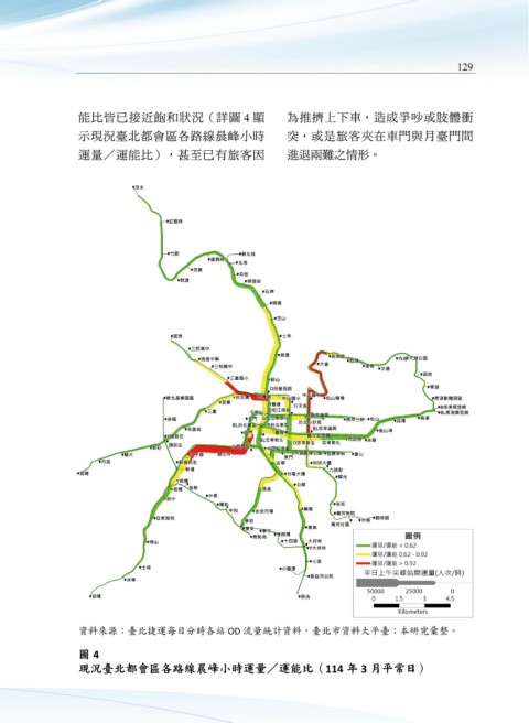 三、 現有捷運路網部分路段尖峰瓶 平常日約有 216 萬人次搭乘,其中 能比皆已接近飽和狀況(詳圖 4 顯 為推擠上下車,造成爭吵或肢體衝