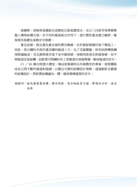 關鍵詞: 超高層建築結構、聯合開發、複合鋼板剪力牆、彈塑性分析、臺北