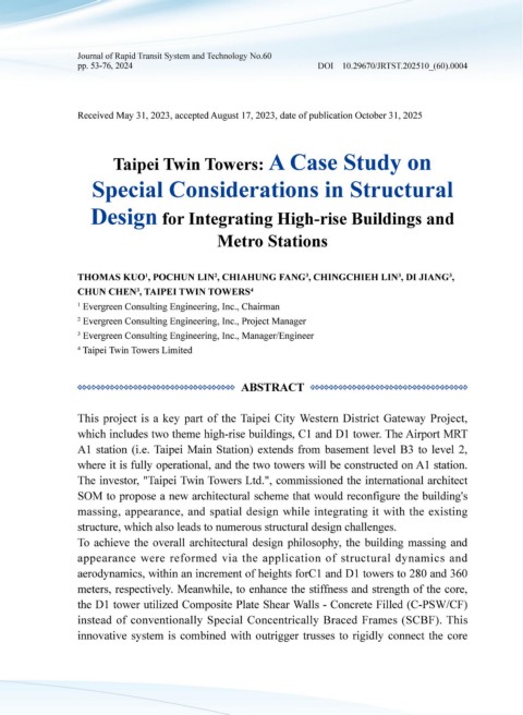 關鍵詞: 超高層建築結構、聯合開發、複合鋼板剪力牆、彈塑性分析、臺北 2 Evergreen Consulting Engineering, Inc., Project Manager